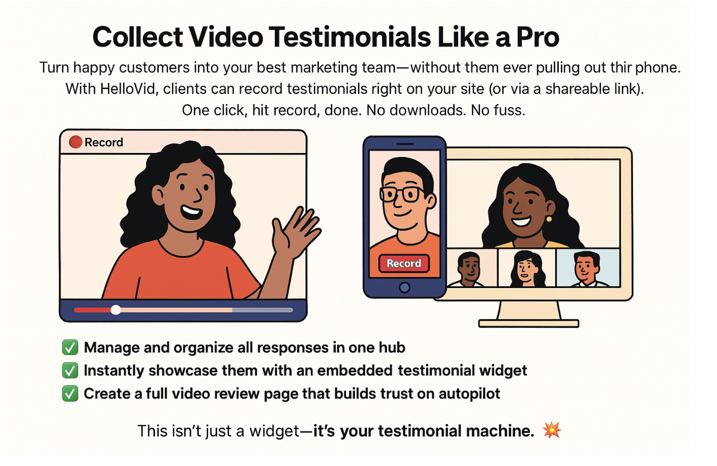 Turn happy customers into your best marketing team—without them ever pulling out their phone. With HelloVid, clients can record testimonials right on your site (or via a shareable link). One click, hit record, done. No downloads. No fuss.